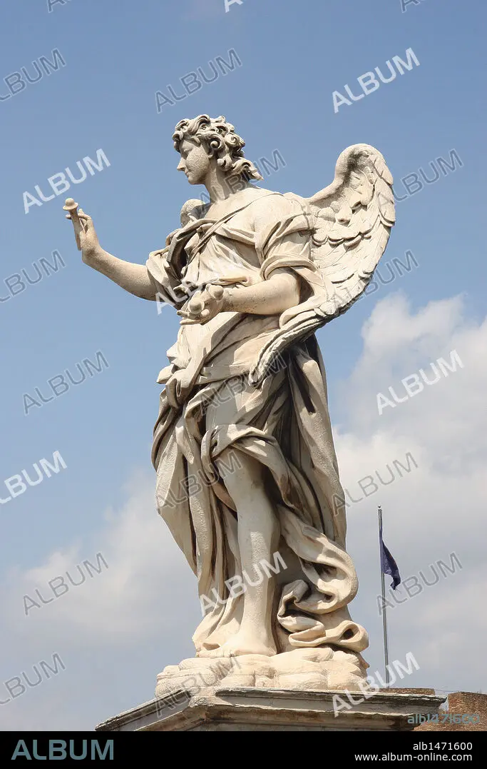 Descripción: ITALIA. ROMA. Vista de una de las ESCULTURAS que decoran el PONTE SANT'ANGELO, diseñadas por BERNINI. Cada una de ellas sostiene un símbolo de la Crucifixión. Este ángel sujeta los CLAVOS. Siglo XVII.