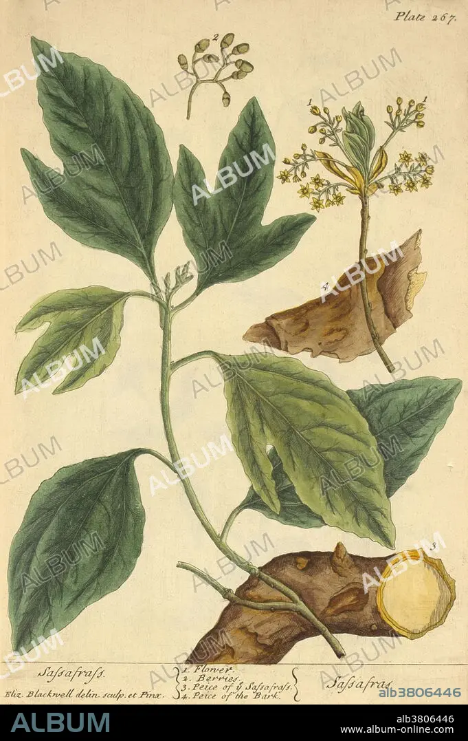 "A Curious Herbal", Plate 267. Sassafras originated in North America. It has served as a treatment for syphilis, scurvy, gout, fluid retention, rheumatic pains, colds and influenza, and skin eruptions. Sassafras is a genus of three extant and one extinct species of deciduous trees in the family Lauraceae. It is used for urinary tract disorders, swelling in the nose and throat, syphilis, bronchitis, high blood pressure in older people, gout, arthritis, skin problems, and cancer. It is also used as a tonic and blood purifier. Some people apply sassafras directly to the skin to treat skin problems, rheumatism, swollen eyes, sprains, and insect bites or stings. Sassafras oil is also applied to the skin to kill germs and head lice. Elizabeth Blackwell (1707-1758) was a famed Scottish illustrator and author who was best known as both the artist and engraver for the plates of "A Curious Herbal" (1737).