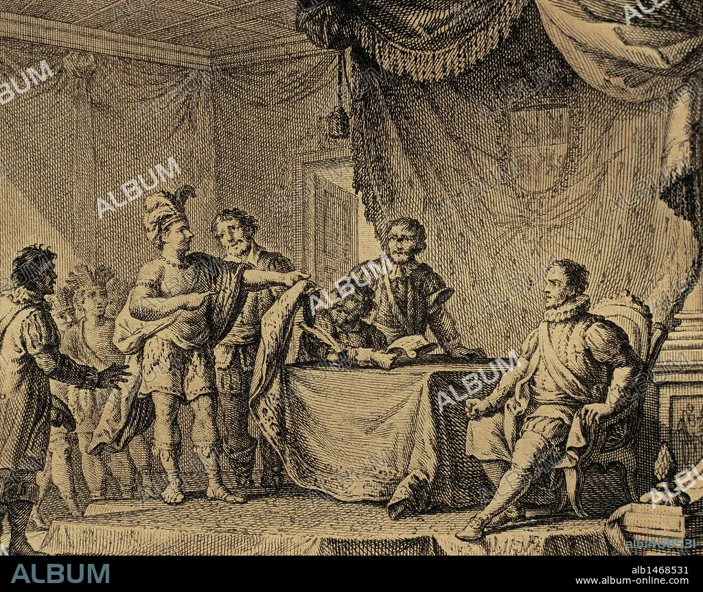 Descripción: CONQUISTA DEL IMPERIO INCA O DEL PERU (siglo XVI). Tratado de sumisión de SAYRI TUPAC, hijo de Manco Capac II, monarca inca, ante Don Andrés Hurtado de Mendoza, III Marqués de Cañete (h.1516-1561), Virrey del Perú. Grabado del 1807.