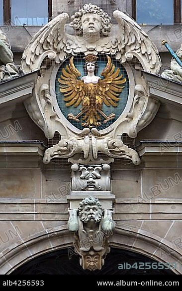 Large Nuremberg coat of arms on the city hall, Nuremberg, Middle Franconia, Bavaria, Germany, Europe.
