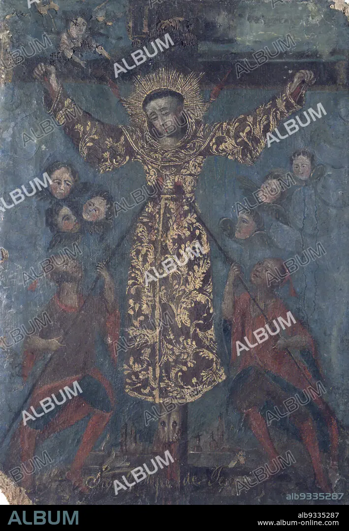 Saint Philip of Jesus, San Felipe de Jesus, Oil on canvas, Mexico, 18th century, 16 1/2 x 11 1/2in., 41.9 x 29.2cm, angels, catholicism, crucifixion, crusifix, fabric, halo, hispanic heritage, Jesus, lance, latin american art, martyr, Mexican Painting, oil on canvas, pattern, religious, religious art, spanish american art.