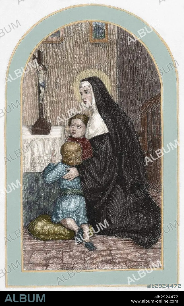 SANTA RITA DE CASIA O SANTA RITA DE CASCIA (1381-1457). Religiosa italiana de la Orden de San Agustín, en la que ingresó tras la muerte de su esposo e hijos. Siglos XIV-XV. Grabado del siglo XIX. Coloreado.