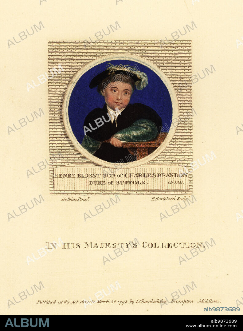 Henry Brandon, 2nd Duke of Suffolk, 1535-1551. Died in the sweating sickness epidemic. English nobleman, the son of Charles Brandon, 1st Duke of Suffolk, by his fourth wife, Catherine Willoughby. Henry, eldest son of Charles Brandon, Duke of Suffolk, ob. 1551. Handcoloured copperplate stipple engraving by Francesco Bartolozzi after a miniature portrait by Hans Holbein the Younger from Imitations of Original Drawings by Hans Holbein, John Chamberlaine, London, 1798.