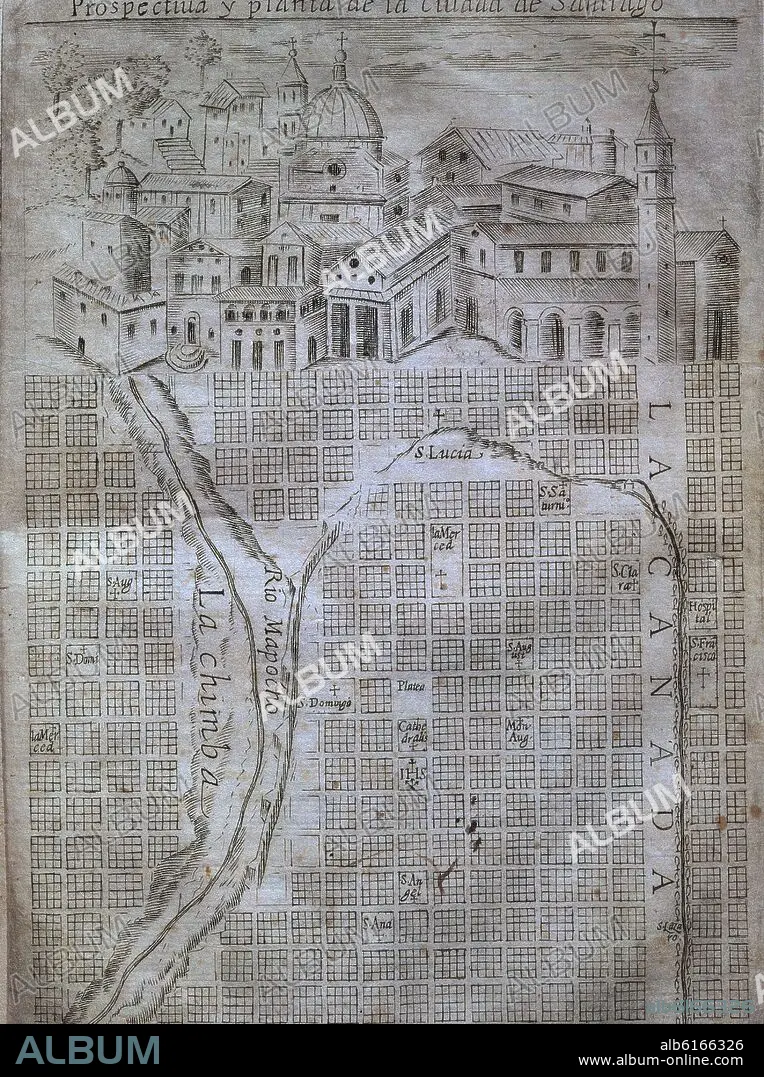 HISTORICA RELACION DEL REINO DE CHILE - PERSPECTIVA Y PLANTA DE LA CIUDAD DE SANTIAGO DE CHILE - SIGLO XVII
