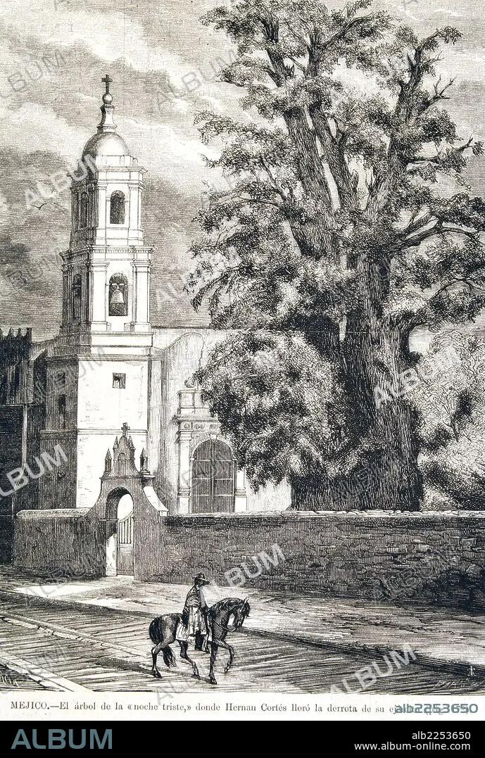 HERNAN CORTES. CONQUISTADOR ESPAÑOL. MEDELLIN 1485 - 1547. EL ARBOL DE LA NOCHE TRISTE EN MEXICO. GRABADO DE LA ILUSTRACION ESPAÑOLA Y AMERICANA