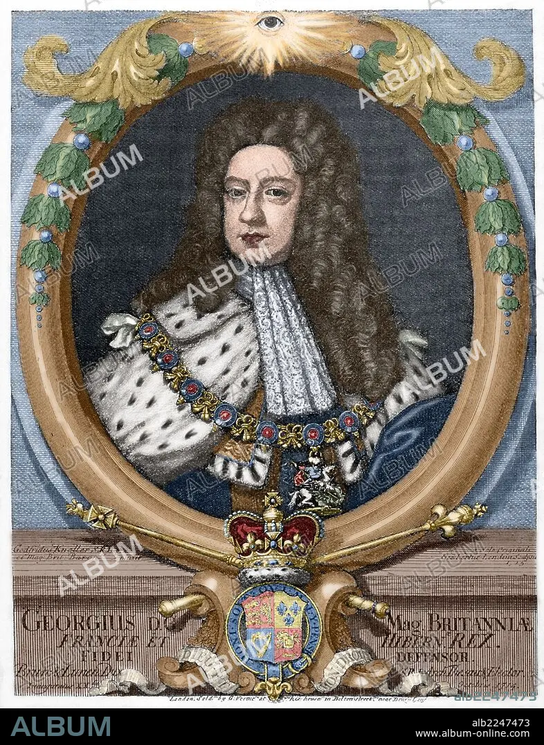 Jorge II de Gran Bretaña y Hannover (1683-1760). Rey de Gran Bretaña y de Irlanda, duque de Brunswick-Luneburgo (en Hannover), Príncipe elector del Sacro Imperio Romano Germánico desde el 11 de junio de 1727 hasta su muerte y duque de Bremen y príncipe de Verden (1727-60). Grabado coloreado de "Historia Universal".