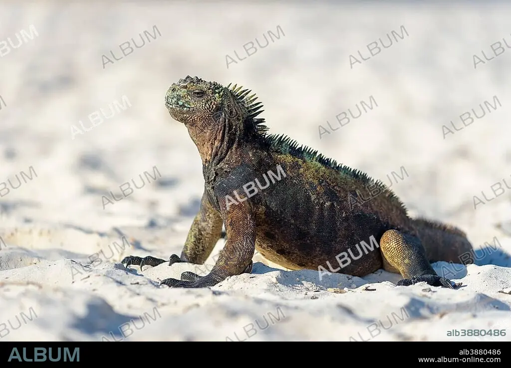 Galápagos marine iguana (Amblyrhynchus cristatus) sitting in sand on beach, sunbathing, Tortuga Bay, Santa Cruz Island, Galapagos, Ecuador, South America.