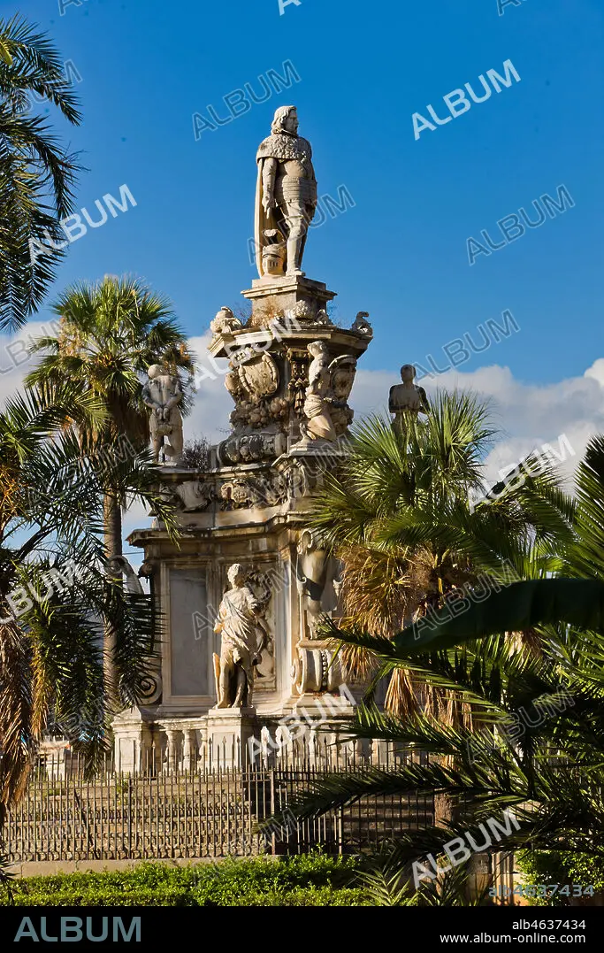 Palermo, the Parliament Square: The Marble Theatre, monument to Philip V, facing The royal Palace or Palace of the Normans. It was realised by Gaspare Guercio, Carlo D'Aprile and Gaspare Serpotta to celebrate the glory of Philip IV of Habsburg, king of Spain and Sicily, called Philip the Great.. Around the pedestal the four parts of the Earth known at that time (Europe, Asia, Africa and America), on which the king of Spain ruled, are depicted. On the first level there are the statues of the four Moors, or the previous kings of the countries that went under his domination. The work is adorned with plaques and coats of arms of the most important families in Sicily. The original statue of Philip IV was destroyed during the Sicilian revolution in 1848 and was replaced in 1856 by the current marble statue representing King Philip V of Spain and was realised by Nunzio Morello.. Detail.