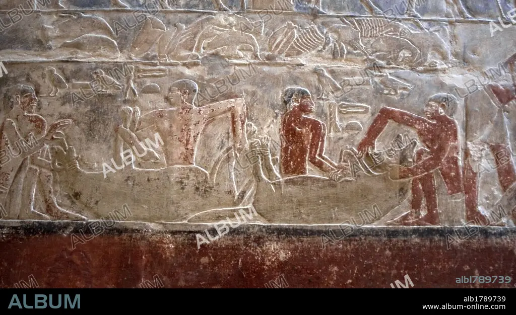 Descripción: ARTE EGIPCIO. EGIPTO. MASTABA DE MERERUKA o MERI (MERA). Tumba familiar de un alto funcionario de la VI DINASTIA del IMPERIO ANTIGUO. Con una única entrada el interior de sus paredes se encuentran ricamente decoradas con RELIEVES menfitas, muchos de ellos, con restos policromados. Relive representando a egipcios capturando hienas. NECROPOLIS DE SAKKARA.