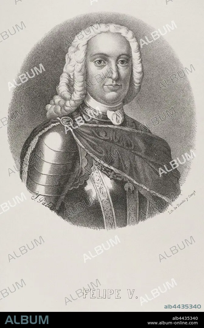 Felipe V de España, llamado"El Animoso" (1683-1746). Rey de España. Dibujo por Salcedo. Litografía. Crónica General de España, Historia Ilustrada y Descriptiva de sus Provincias. Galicia,1866. Biblioteca Histórico Militar de Barcelona, Cataluña, España.