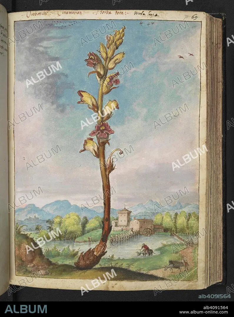 GHERALDO CIBO. Orobanche (broomrape or broom-rape) is a genus of over 200 species of parasitic herbaceous plants in the family Orobanchaceae. Coloured drawings of plants, copied from nature in the Roman States, by Gerardo Cibo. Vol. I. Pietro Andrea Mattioli, Physician, of Siena: Extracts from his edition of Dioscorides' "de re Medica":. Italy, c. 1564-1584. Source: Add. 22332 f.70. Language: Italian.