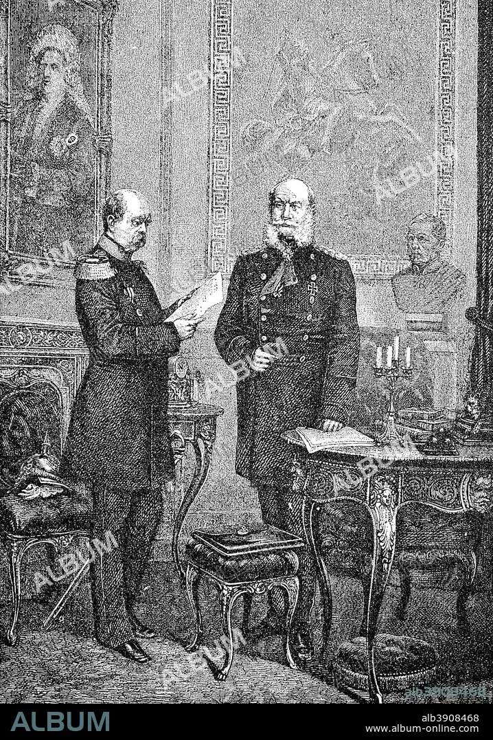 The emperor and his chancellor, William I or Wilhelm I, full name is William Frederick Louis of Hohenzollern, King of Prussia and the first German Emperor, reproduction of a woodcut publication from the year 1888, Germany, Europe.
