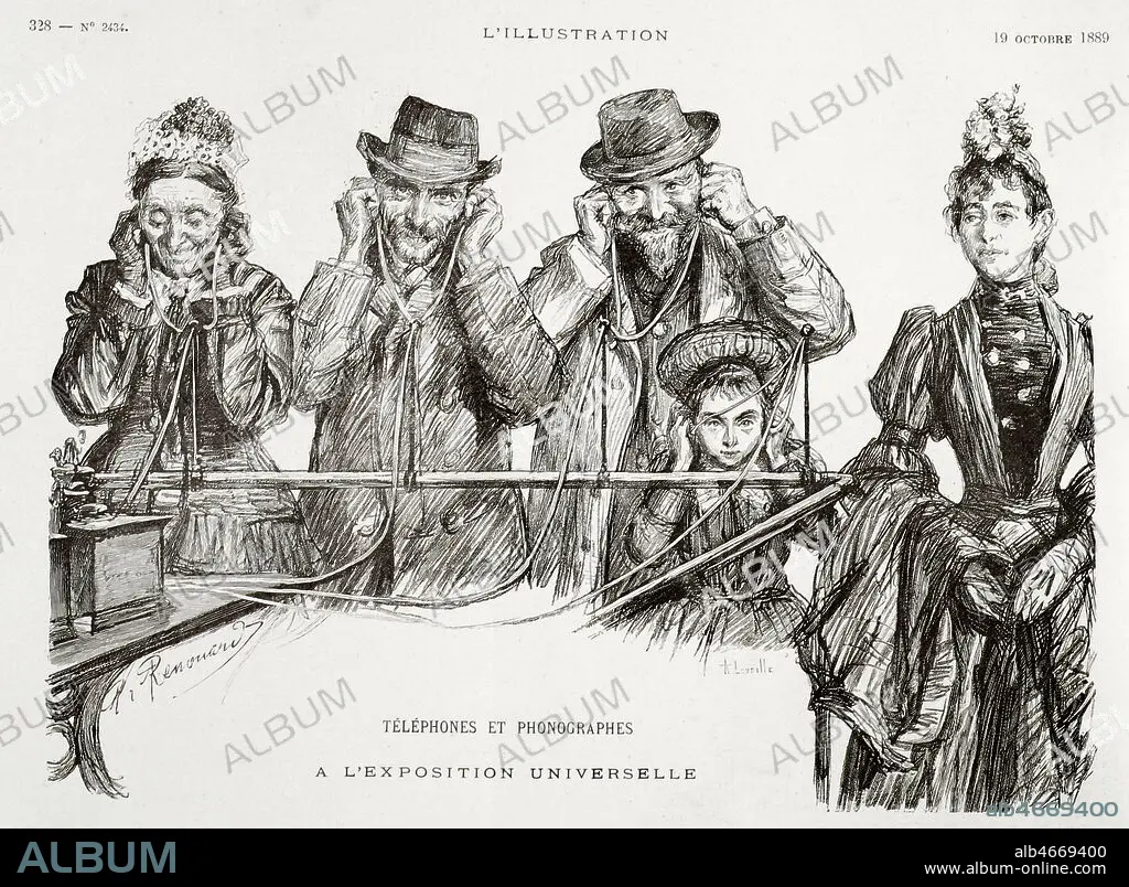 'Telephones et phonographes, a l'exposition universelle' de 1889. Le theatrophone, systeme mis au point par Clement ADER (1841-1925) permet d' entendre a l'aide des telephones les representations de l'Opera. Gravure publiee en octobre 1889. Credit : Collection KHARBINE-TAPABOR.
