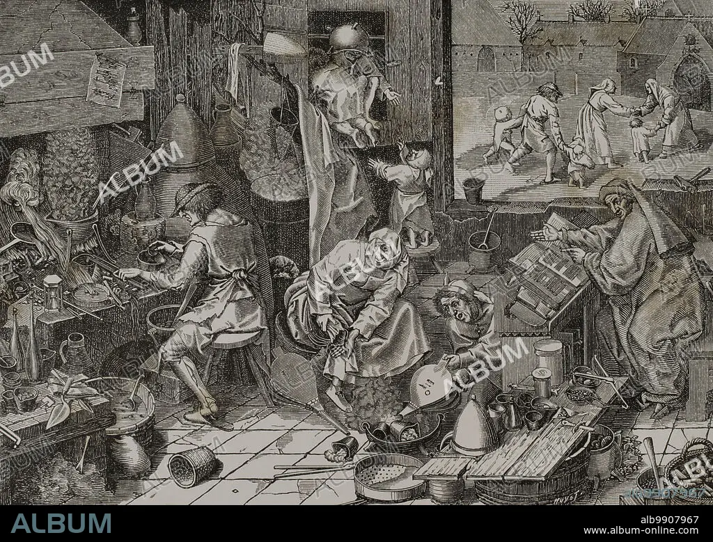 Descripción: Laboratorio de un alquimista. Grabado por Huyot a partir de una tabla de Pieter Brueghel el Viejo y grabado por Jerome Cock en el siglo XVI. Sciences & Lettres au Moyen Age et à l'époque de la Renaissance. París, 1877.
