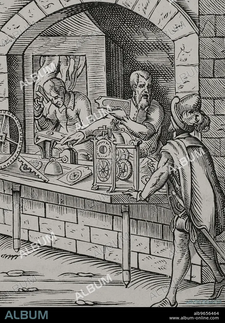 JOST AMMAN (1539-1591). SWISS-GERMAN ARTIST.. El Relojero. Taller. Grabado por Jost Amman. Siglo XVI. "Les Arts au Moyen Age et a l'Epoque de la Renaissance", por Paul Lacroix. París, 1877.