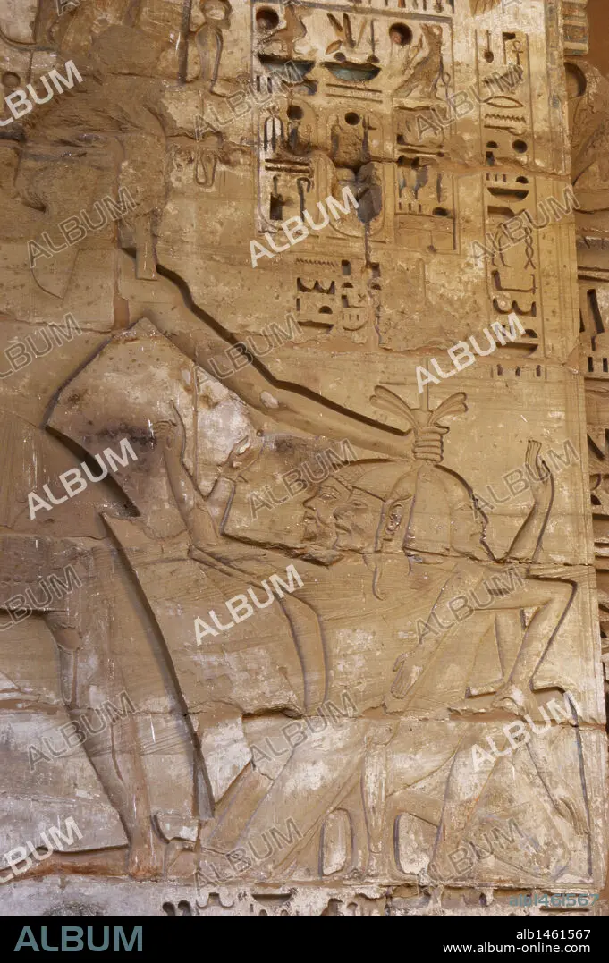 ARTE EGIPCIO. TEMPLO DE RAMSES III. Relieves con la representación del faraón RAMSES III VICTORIOSO CON PRISIONEROS DE GUERRA. Imperio Nuevo. (1550-1069 a. C). Dinastía XX. TEBAS. Medinet-Habou. Egipto.
