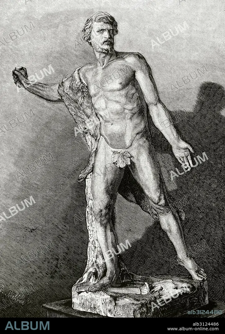 VIRIATO (m. -139). Caudillo lusitano. Durante la sublevación de los lusitanos contra la expansión de Roma en Hispania a mediados del siglo II a. C. Venció a los ejércitos romanos. Grabado de la escultura de Jose Bellver, Viriato. Grabado por Severini. La Ilustración Española y Americana, 1872.
