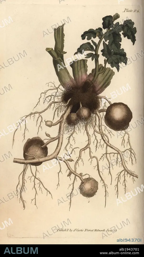 Roots and tubers of the potato plant Solanum tuberosum. Handcoloured copperplate engraving of a botanical illustration by Sydenham Edwards for William Curtis's "Lectures on Botany, as delivered in the Botanic Garden at Lambeth," 1805. Edwards (1768-1819) was the artist of thousands of botanical plates for Curtis' "Botanical Magazine" and his own "Botanical Register."