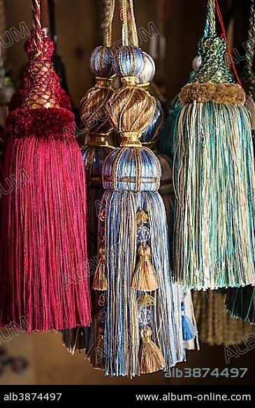 Passementerie, fringe tassels with various patterns, range of colours and manufacturing styles, Munich, Bavaria, Germany, Europe.