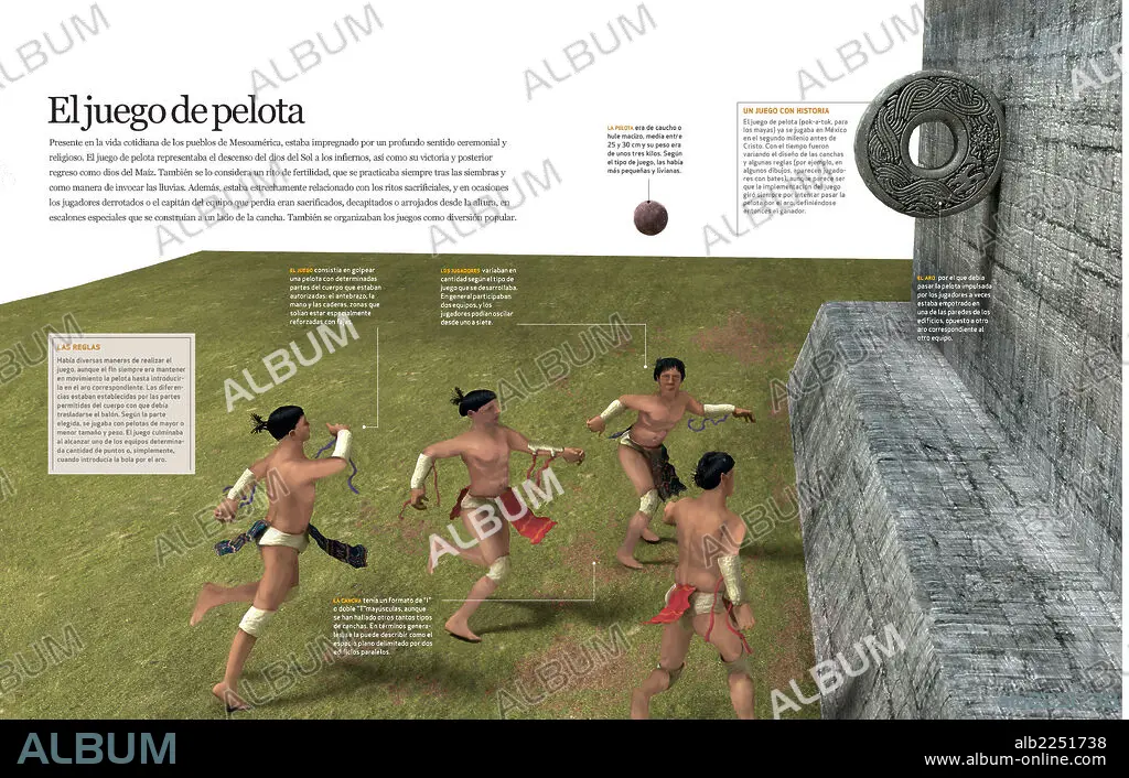 Descripción: Infografía sobre el juego de pelota de la sociedad maya, sus reglas y su sentido ceremonial y religioso.