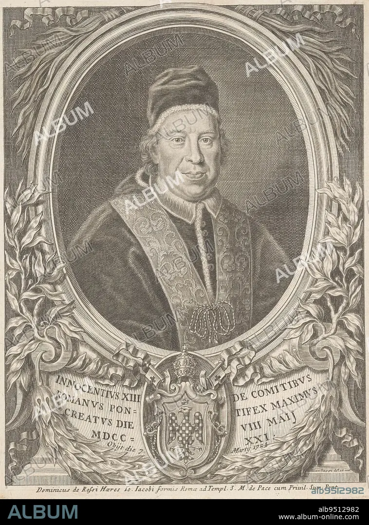 Portrait of Pope Innocent XIII, print maker: Girolamo Rossi (II), (mentioned on object), intermediary draughtsman: Girolamo Rossi (II), (mentioned on object), publisher: Domenico de'Rossi, (mentioned on object), print maker: Rome, intermediary draughtsman: Rome, publisher: Rome, Vaticaanstad, 1724 - 1762, paper, engraving, h 247 mm × w 189 mm