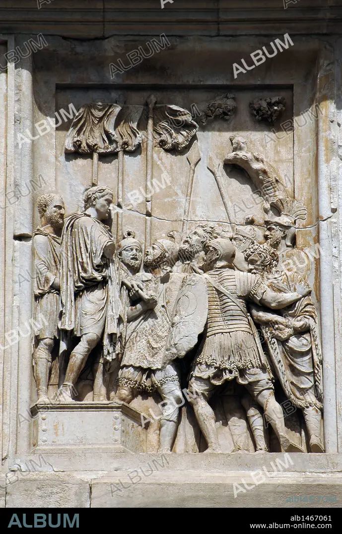 Descripción: ARTE ROMANO. ITALIA. ARCO DE CONSTANTINO. Arco triunfal erigido en el siglo IV por el Senado en honor del emperador Constantino, tras su victoria sobre Majencio en el Puente Milvio (313). Detalle de un RELIEVE. ROMA.