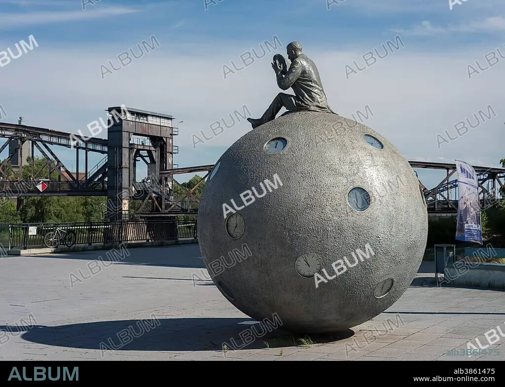 Sculpture Zeitzähler, time counter, 2008, artist Gloria Friedmann, shows the time at great rivers of the world, Magdeburg, Saxony-Anhalt, Germany, Europe