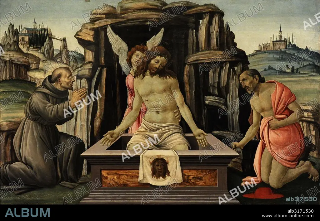 Jacopo del Sellaio (1442-1494). Pintor italiano. Escuela Florentina. Lamentación sobre Cristo Muerto con los Santos Francisco y Jerónimo. Museo del Hermitage (The State Hermitage Museum). San Petersburgo. Rusia.