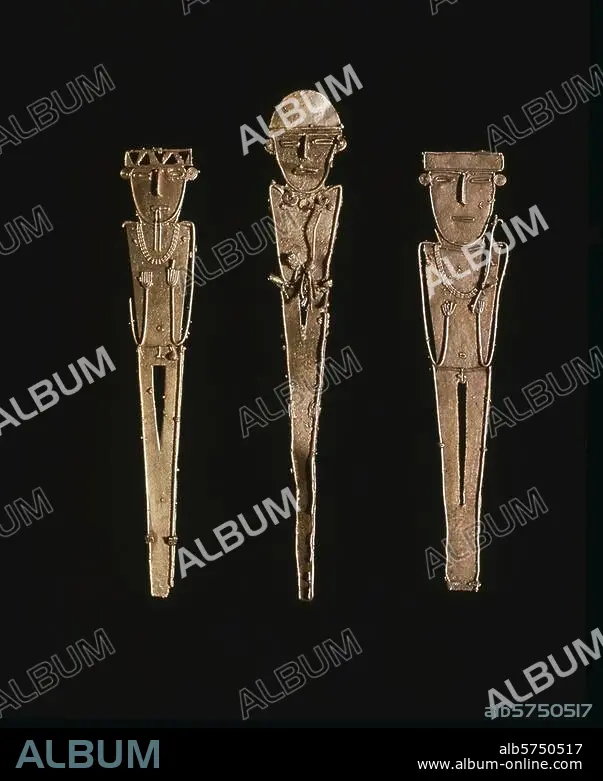 Colombian art, Muisca culture, c. 650-1550 AD. Three tunjos (votive objects) in human form . Gold. Bogota, Gold Museum.