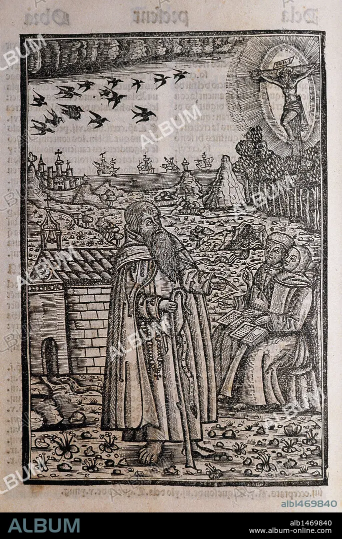 LITERATURA CATALANA SIGLOS XIII Y XIV. LLULL, Ramon (Palma de Mallorca, 1233/35-Bujía, 1315/16). Filósofo, místico y literato mallorquín. "BLANQUERNA". Grabado de Ramón Llull predicando o hablando con dos personas o discípulos. Biblioteca Bartomeu March. Palma de Mallorca. Islas Baleares. España.