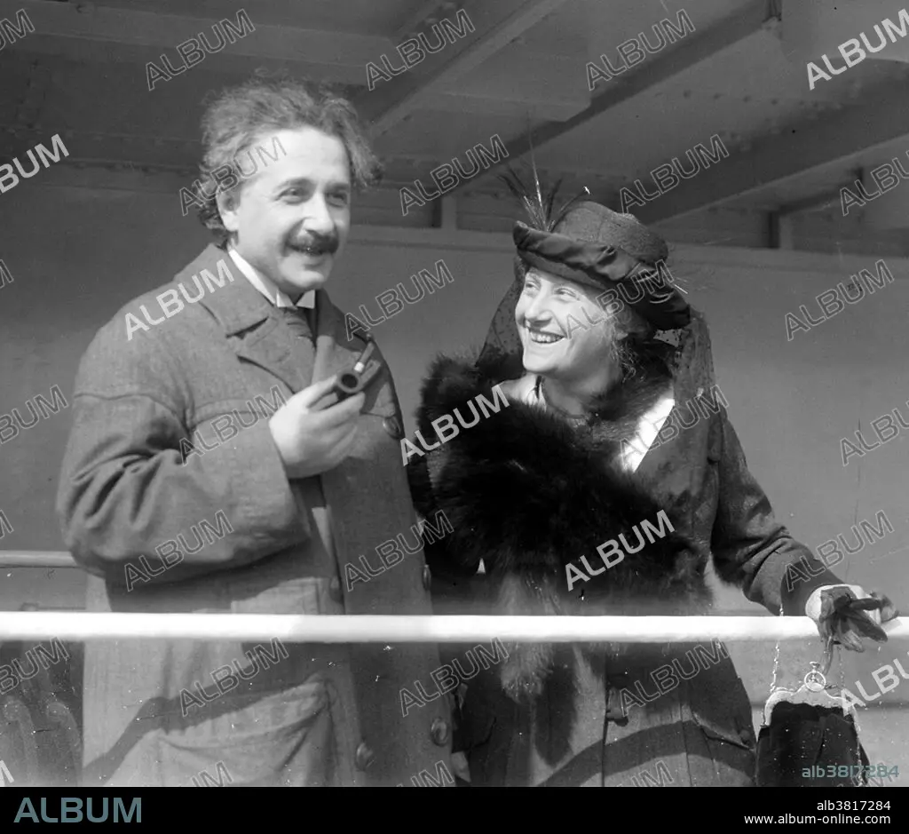 Albert Einstein and his second wife Elsa, whom he married in 1919. Elsa Einstein (January 18, 1876 - December 20, 1936) was the second wife of Albert Einstein. Elsa had the surname of Einstein at birth, lost it when she took the name of her first husband Max Löwenthal, and regained it in 1919 when she married her cousin Albert. Albert Einstein (March 14, 1879 - April 18, 1955) was a German-born theoretical physicist who developed the general theory of relativity, effecting a revolution in physics. Einstein is often regarded as the father of modern physics and the most influential physicist of the 20th century. While best known for his mass-energy equivalence formula E = mc2, he received the 1921 Nobel Prize in Physics for his services to theoretical physics, and especially for his discovery of the law of the photoelectric effect. The latter was pivotal in establishing quantum theory within physics. Photographed by Bain News Service, 1921.