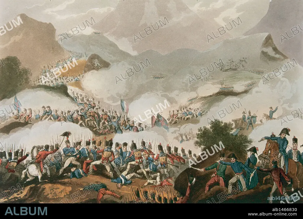 GUERRA DE LA INDEPENDENCIA ESPAÑOLA. "BATALLA DE LOS PIRINEOS" (28 de julio de 1813). Ofensiva hispanobritánica contra los últimos ejércitos imperiales franceses en la península. Grabado coloreado del s. XIX.