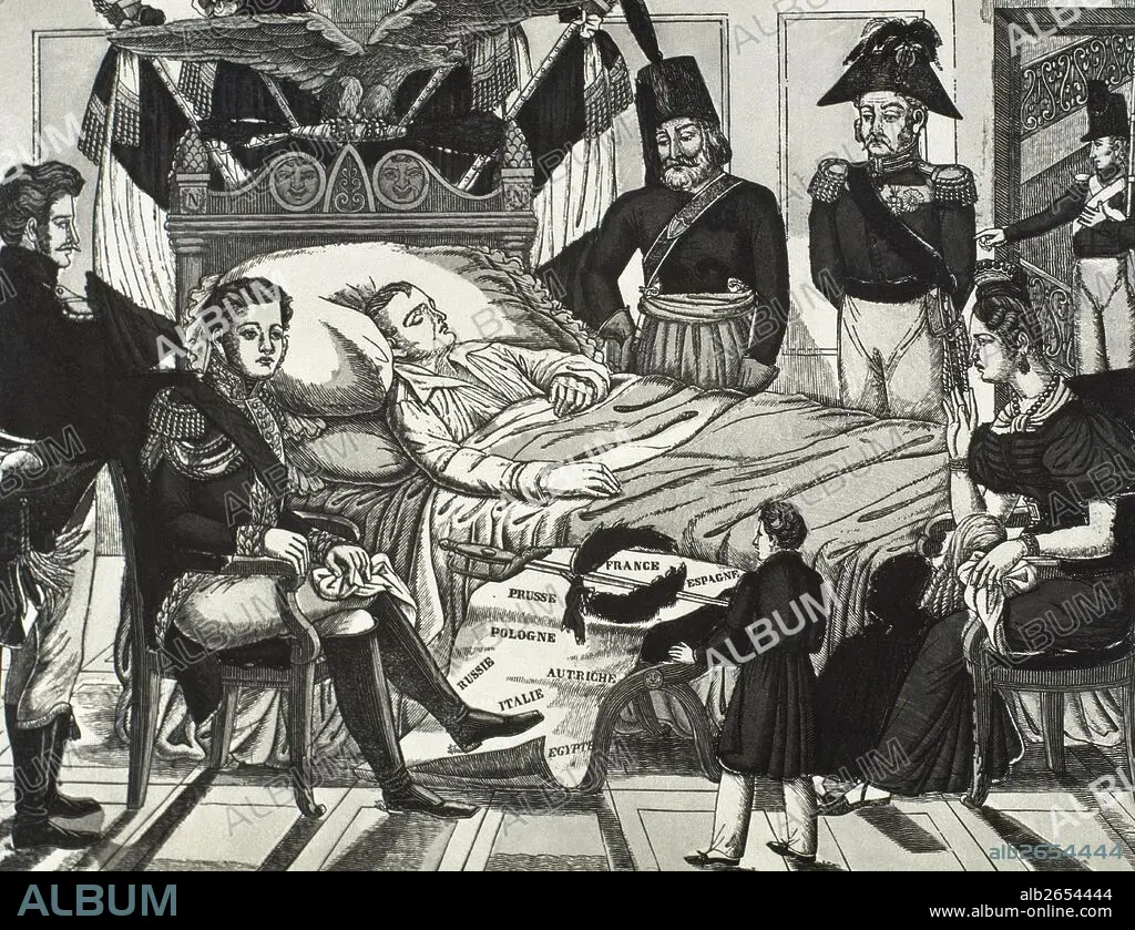 Descripción: NAPOLEON I BONAPARTE (Ajaccio, 1769-Santa Elena, 1821). Brillante general y admirable administrador, se convirtió en Cónsul Vitalicio (1802) y luego en Emperador de los franceses (1804-1815). Vencido en Waterloo el 18 de junio de 1815, se entregó a los británicos, que lo desterraron a la isla de Santa Elena (en el Atlántico Sur). Allí murió el 5 de mayo de 1821. "MUERTE DE NAPOLEON". Grabado.