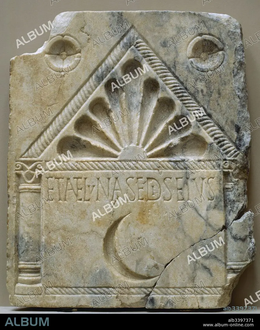 Cancel de la Luna. Estela en mármol (60 x 50 cm), siglos VI-VII. Muestra esculpida la entrada a un templete edículo, con una luna crepuscular. Procede de Mérida (Badajoz). Museo Nacional de Arte Romano. Mérida. Provincia de Badajoz. Extremadura.