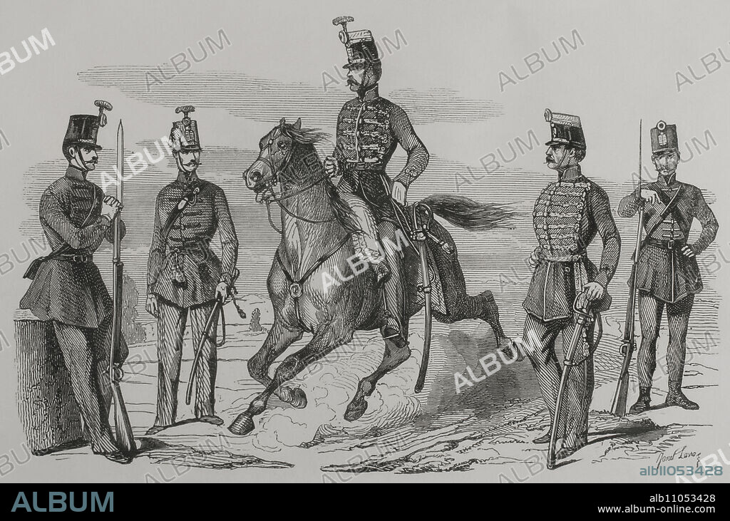 ANGE-LOUIS JANET-LANGE (1811-1872). FRENCH ARTIST.. Caballería e infantería húngaras en 1849. Grabado por Janet Lange. "Los Héroes y las Grandezas de la Tierra". Tomo VIII. 1856.