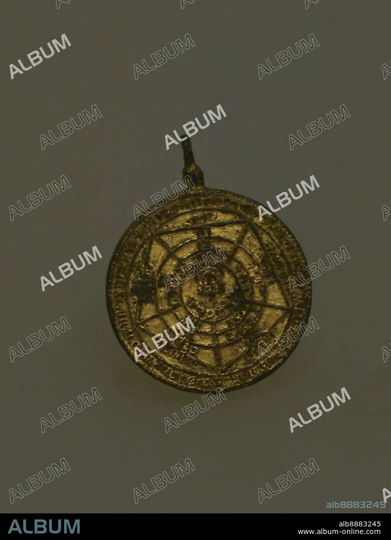 Descripción: Amuleto con inscripciones hebreas. Siglos XV-XVI. Anverso con la representación de Cristo en un pentágono. Fue utilizado por cristianos que viajaron por el Mediterráneo rumbo a Tierra Santa. Bronce con baño de oro. Hallado en la Iglesia de San Pedro (Cuenca, España). Museo Sefardí. Toledo. Castilla-La Mancha. España.