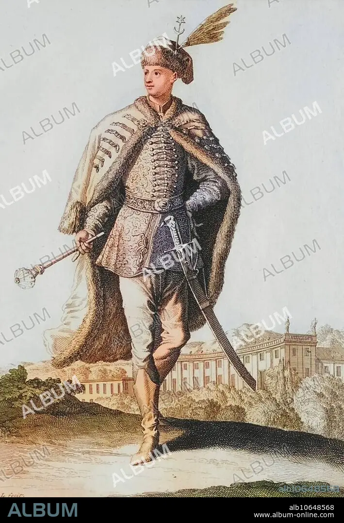 Traditional traditional costume, clothing, an elegant gentleman from Hungary with a sword, c. 1705, copperplate engraving by Caspar Luyken from 1703, digitally restored reproduction from an 18th century model