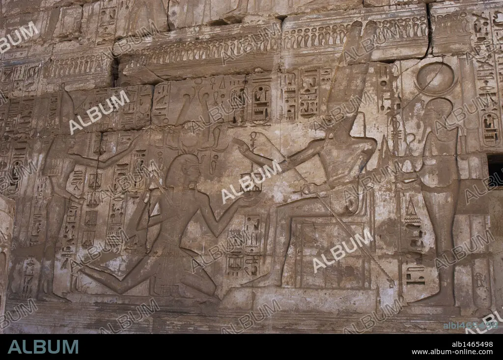 ARTE EGIPCIO. EGIPTO. TEMPLO DE RAMSES III. Relieves con la representación de faraón con tocado Chum entre divinidades (Amón y Ptah). 20 Dinastía. IMPERIO NUEVO. MEDINET HABU. Tebas Oeste. Egipto.