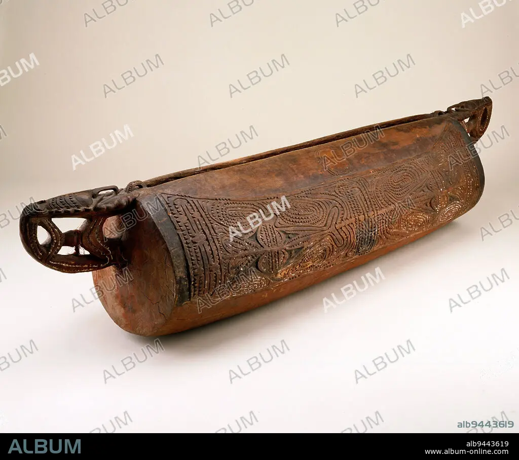 Slit Drum (garamut), 20th century, 98 x 20 in. (248.92 x 50.8 cm), Wood, pigments, fiber Wood, pigment, fiber, Papua New Guinea, 20th century, Carved from a felled tree the slit drum, or garamut, is the most important instrument in the Sepik River region. It is engraved and painted in different stages, and kept in the men's ritual house for ceremonies such as male initiations. This drum still has remnants of its original red, white, and black pigments, while carvings on the drum's body show what appear to be two fish surrounded by intricate curvilinear designs. The finials of the garamut are ornamented with figures characteristic of the Sepik region with their long, hooked noses and tiered headdresses. These figures represent important ancestors and demonstrate clan affiliation.
