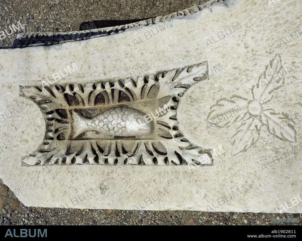 ARTE ROMANO. ASIA MENOR. TURQUIA. Detalle escultórico de un PEZ. TEATRO (S. II d. C). Yacimiento Arqueológico de HIERAPOLIS. Pamukkale. Península Anatólica.