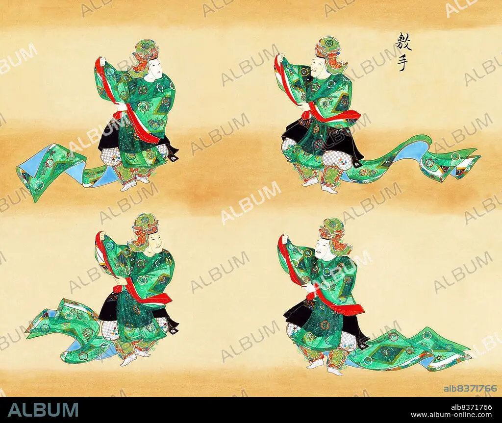 Título: Japan: Bugaku< / i> dancers depicted in a horizontal emaki< / i> scroll painting, the Makura no Soshi Ekotoba< / i>, Kamakura Period (11851333),12th-13th Century