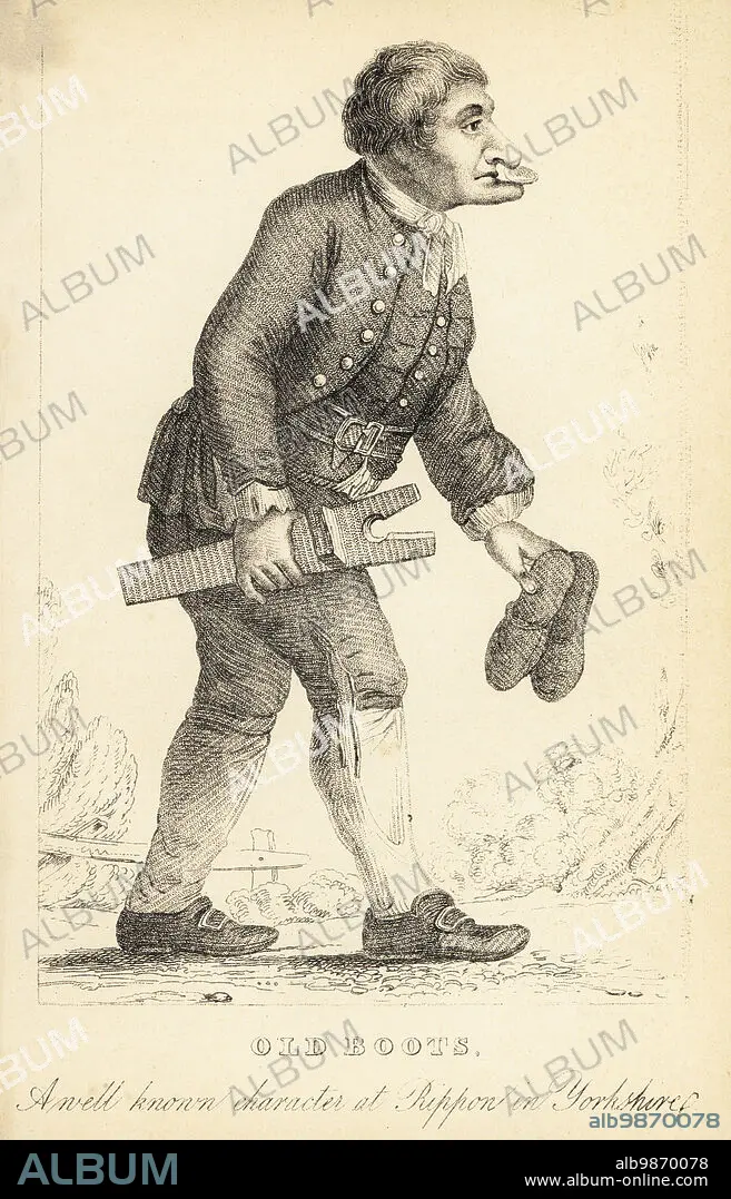 Old Boots, boot-cleaner of Ripon, Yorkshire, 1692-1762. Famous for being able to hold a coin between nose and chin. Shown holding a boot-jack and slippers. Old Boots, a well-known character at Rippon in Yorkshire. Lithograph after a stipple engraving by Robert Cooper from Henry Wilson and James Caulfields Book of Wonderful Characters, Memoirs and Anecdotes, of Remarkable and Eccentric Persons in all ages and countries, John Camden Hotten, Piccadilly, London, 1869.