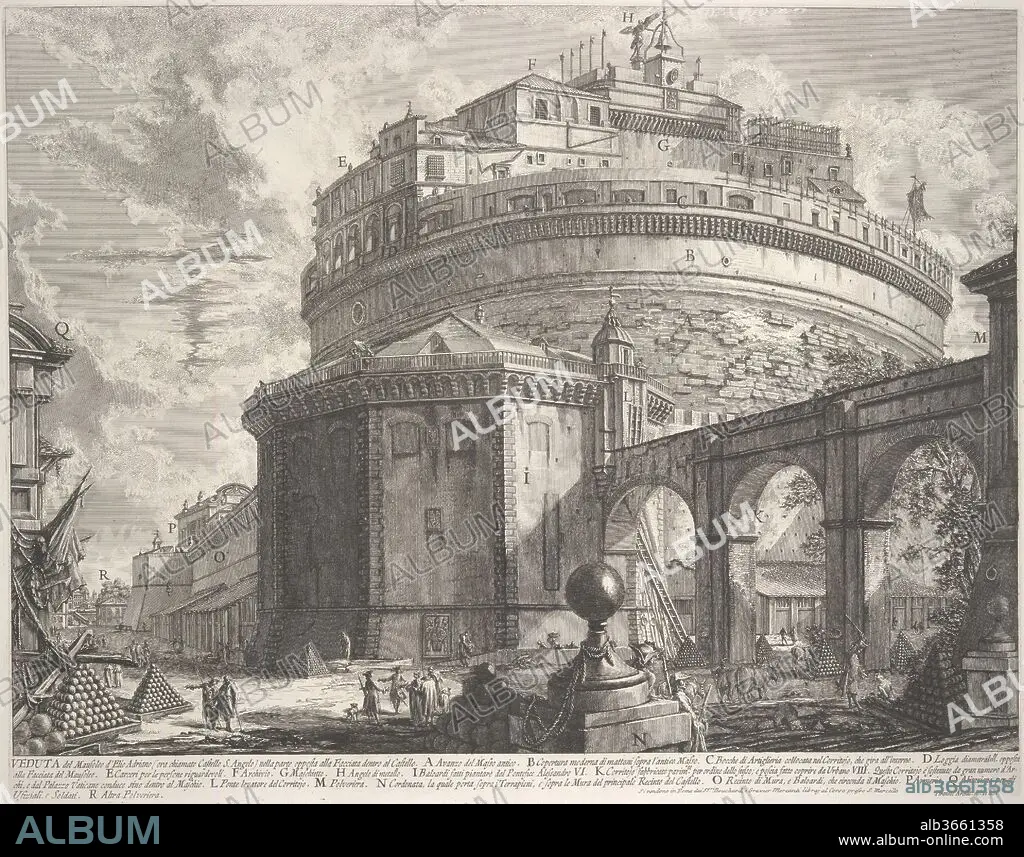 Piranesi's earliest views of Rome, such as the Piazza del Popolo (37.45.3.49), had placed the principal buildings at the back of a vast, tilted space, filled with a diversity of human activity. By the mid-1750s, the monuments fill the space more commandingly, and are seen as if from below and close at hand, as in this view of the Castel Sant'Angelo. Piranesi produced this view at the same time he was working on the Antichità Romane (41.71.1.3.49; 41.71.1.3.53), his four-volume archaeological treatise, and it may have been originally intended for that work. The clear didactic character of the image and the type of lettering are characteristic of the Antichità Romane, although the dramatic view of the castle as it appeared in the eighteenth century is entirely in keeping with the other Vedute. The buildings at the top of the structure served as a gracious and well-fortified refuge for the pope in times of trouble--the corridor that stretches to the right atop huge arches leads all the way to the Vatican Palace.