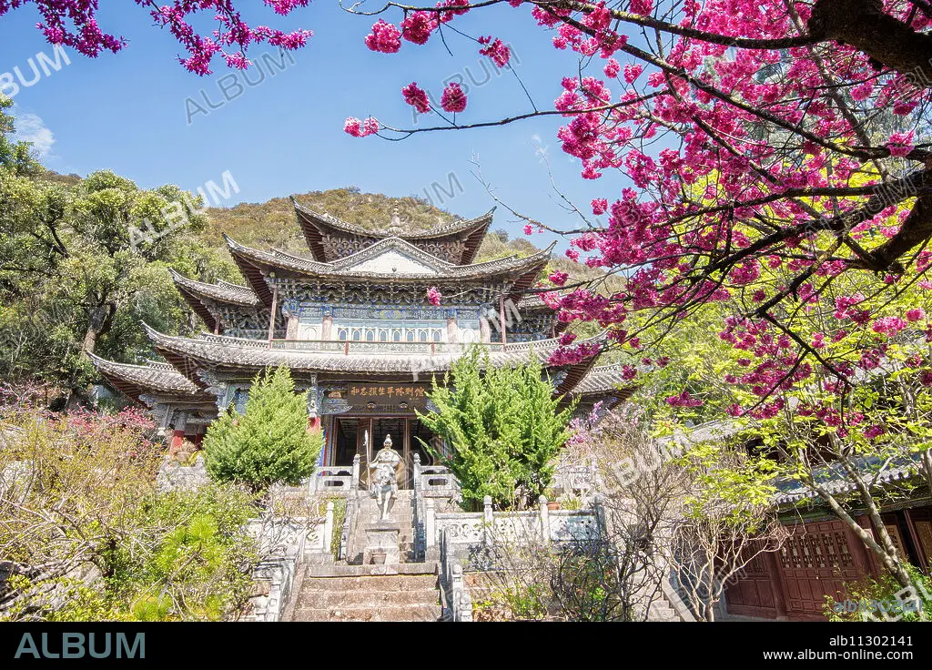 Fu Guo Temple, Five Phoenix Building (formerly Buddhist Cloud Building) in spring, Lijiang, Yunnan, China, Asia