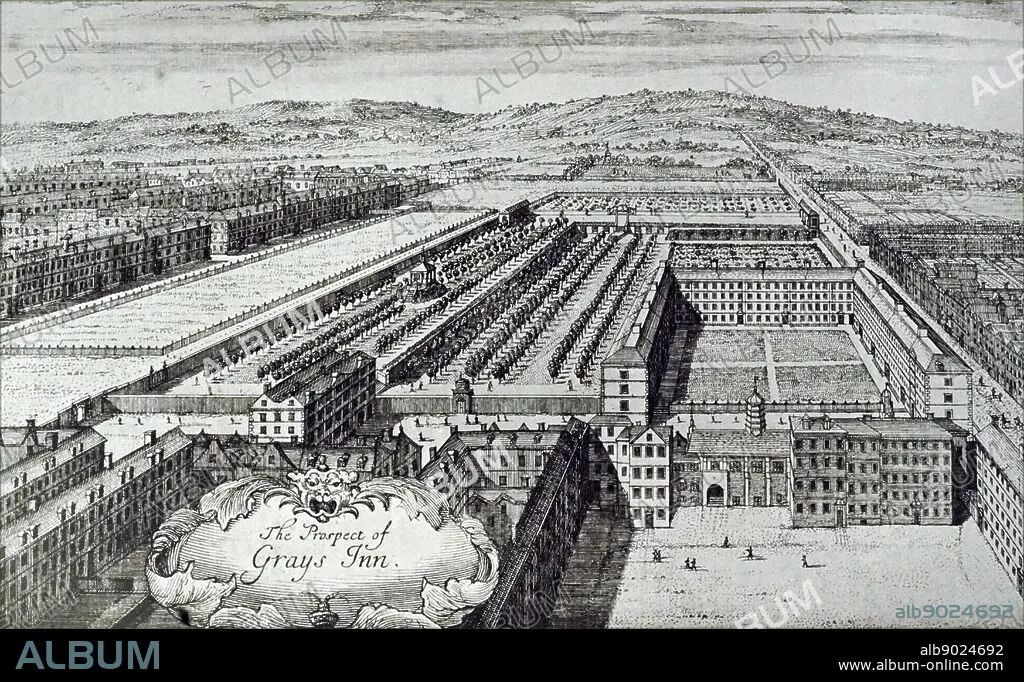 18th century engraving of Gray's Inn area of London, England, 1755.