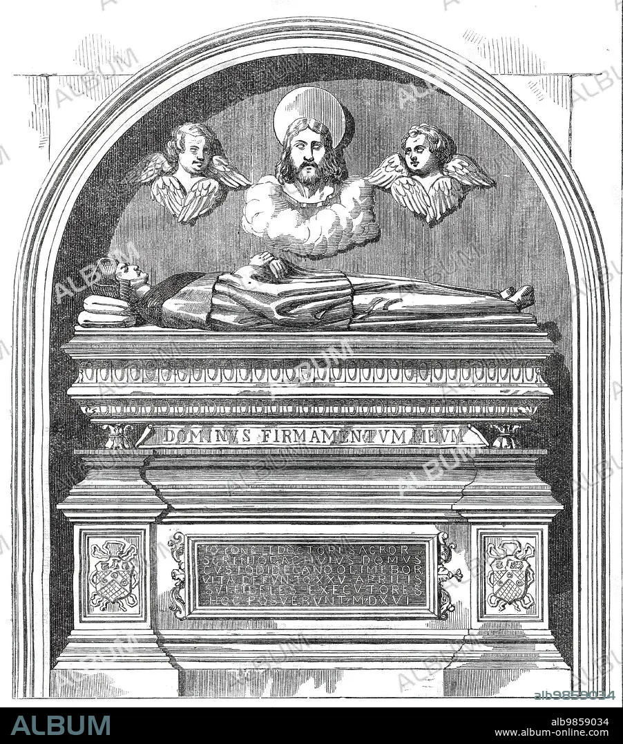 Monument to Dr. John Yonge, by Torrigiani, in the Rolls Chapel, [Chancery Lane, London], 1860. 'Among the monuments almost hidden from view in the quaint old Chapel of the Rolls - an edifice now undergoing restoration...is one by no less an artist than Torrigiani...This monument is to the memory of Dr. John Yonge, who was appointed Master of the Rolls during the reign of Henry VII., and retained the office until his death [in 1516]...It represents the effigy in a recumbent attitude, habited in a long red robe and deep square cap, the face of the figure being wonderfully fine. In a recess above is a head of Christ, between two cherubim, in bold relief'. From "Illustrated London News", 1860.