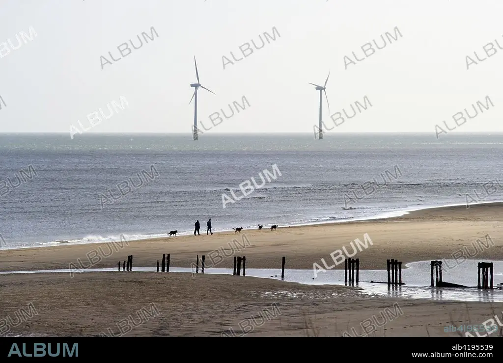 Wind Turbines, Blyth Offshore Wind Farm, Northumberland, 2010. View across the beach towards two wind turbines that are part of the wind farm.