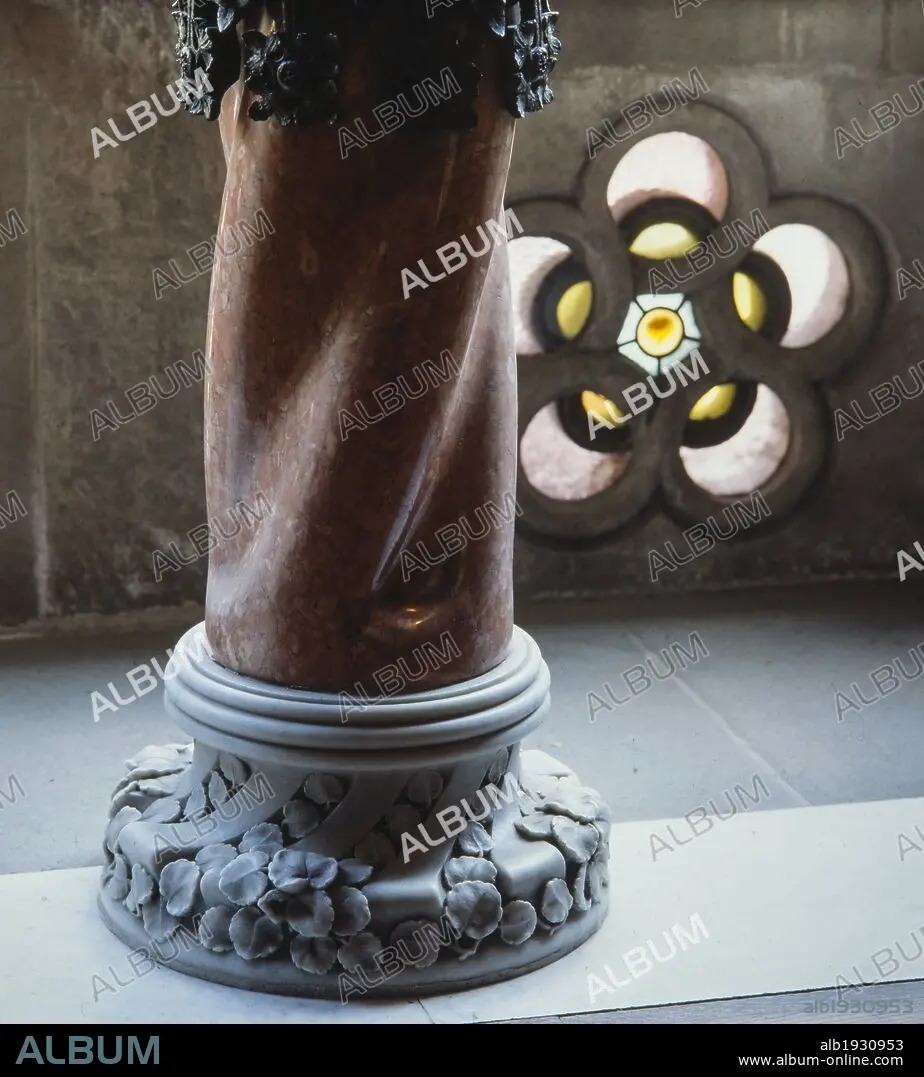 JOSEP PUIG I CADAFALCH. Casa Amatller, 1898-1900.  Detalle de columna de mármol rosa y base con ornamentación floral. Modernismo. Barcelona.