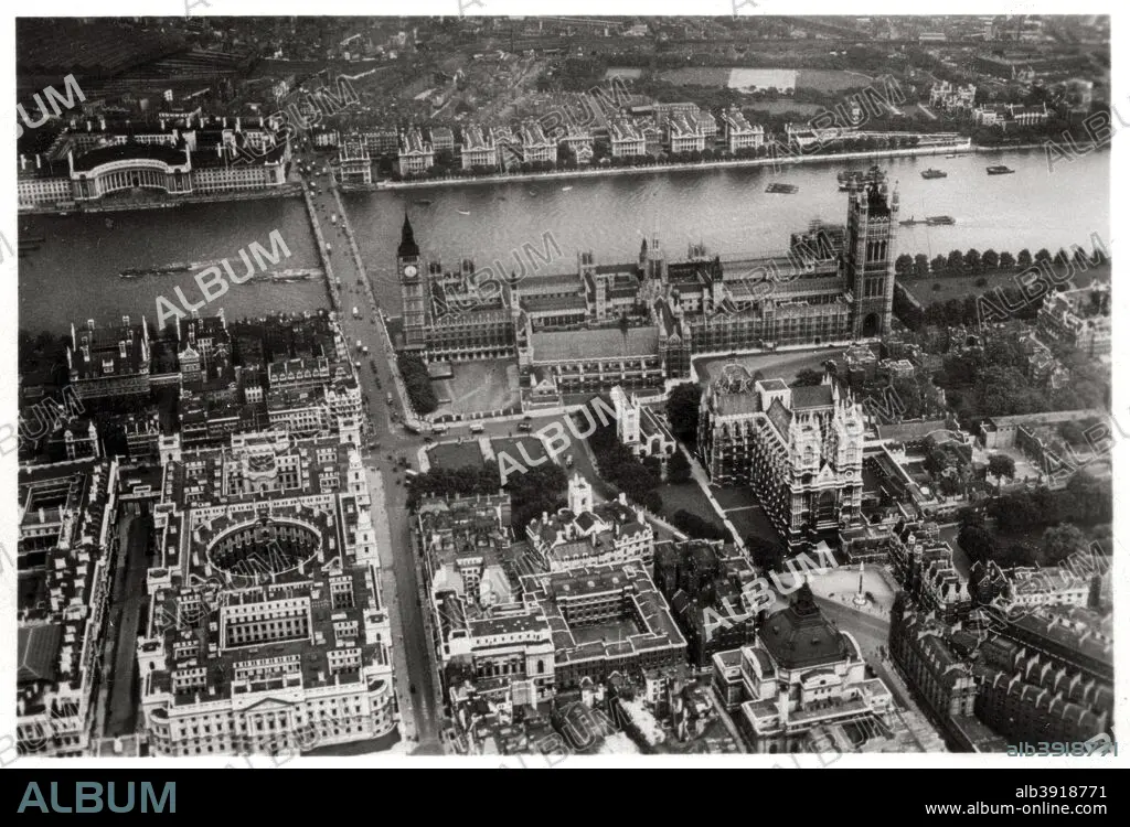 Aerial view of Westminster, London, from a Zeppelin, 1931 (1933). View showing Whitehall, Westminster Abbey, the House of Parliament and Westminster Bridge, with County Hall visible on the opposite bank of the Thames. A photograph from Zeppelin-Weltfahrten, Vom ersten Luftschiff 1899 bis zu den Fahrten des LZ127 Graf Zeppelin 1932, Dresden, 1933.