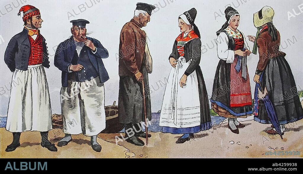 People in traditional costumes, fashion, clothes in Germany, costumes of Western Pomerania around the 19th century, the costumes of the fishermen and the fisher women from Moenchgut on the island of Ruegen, illustration, Germany, Europe